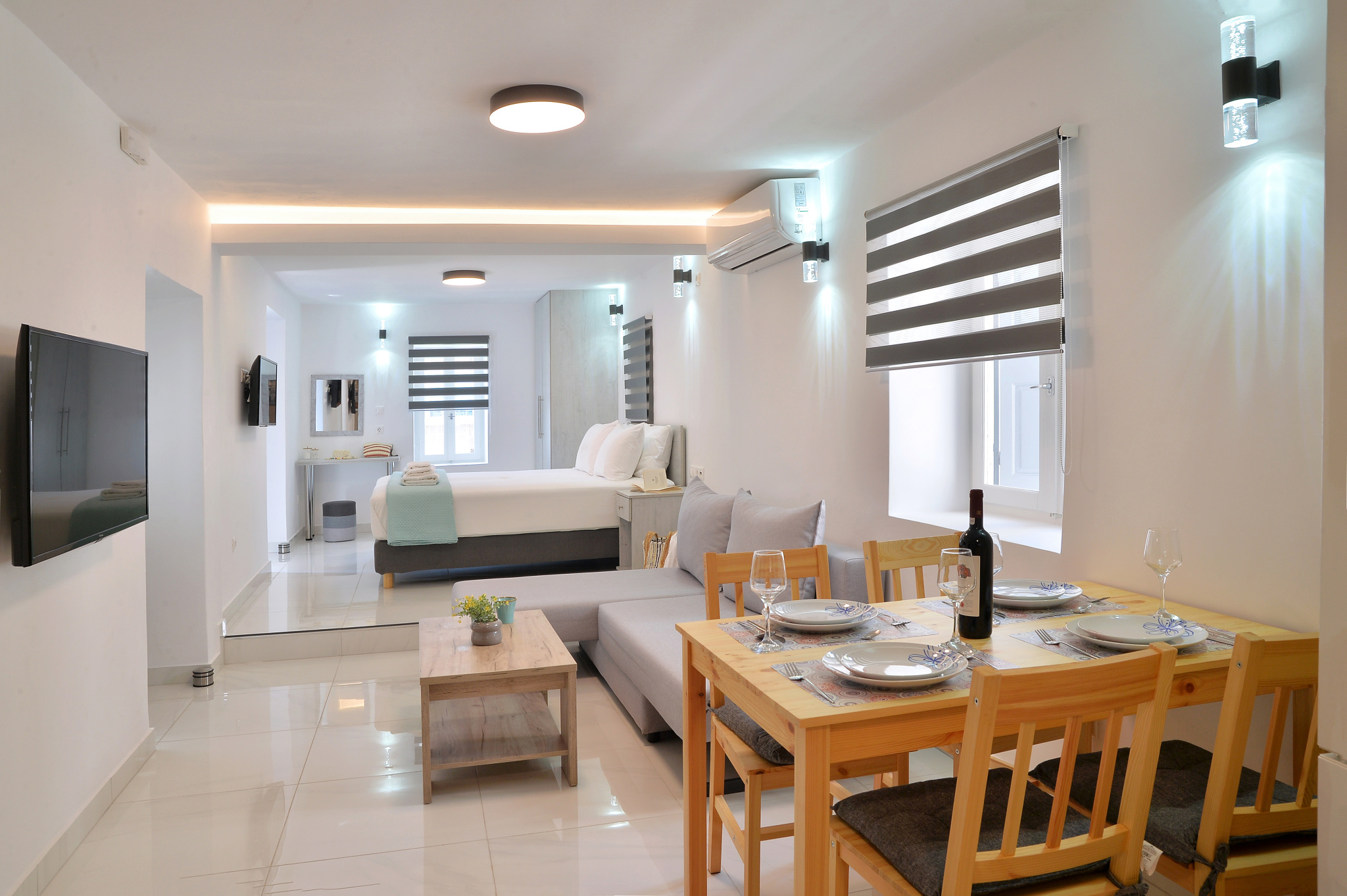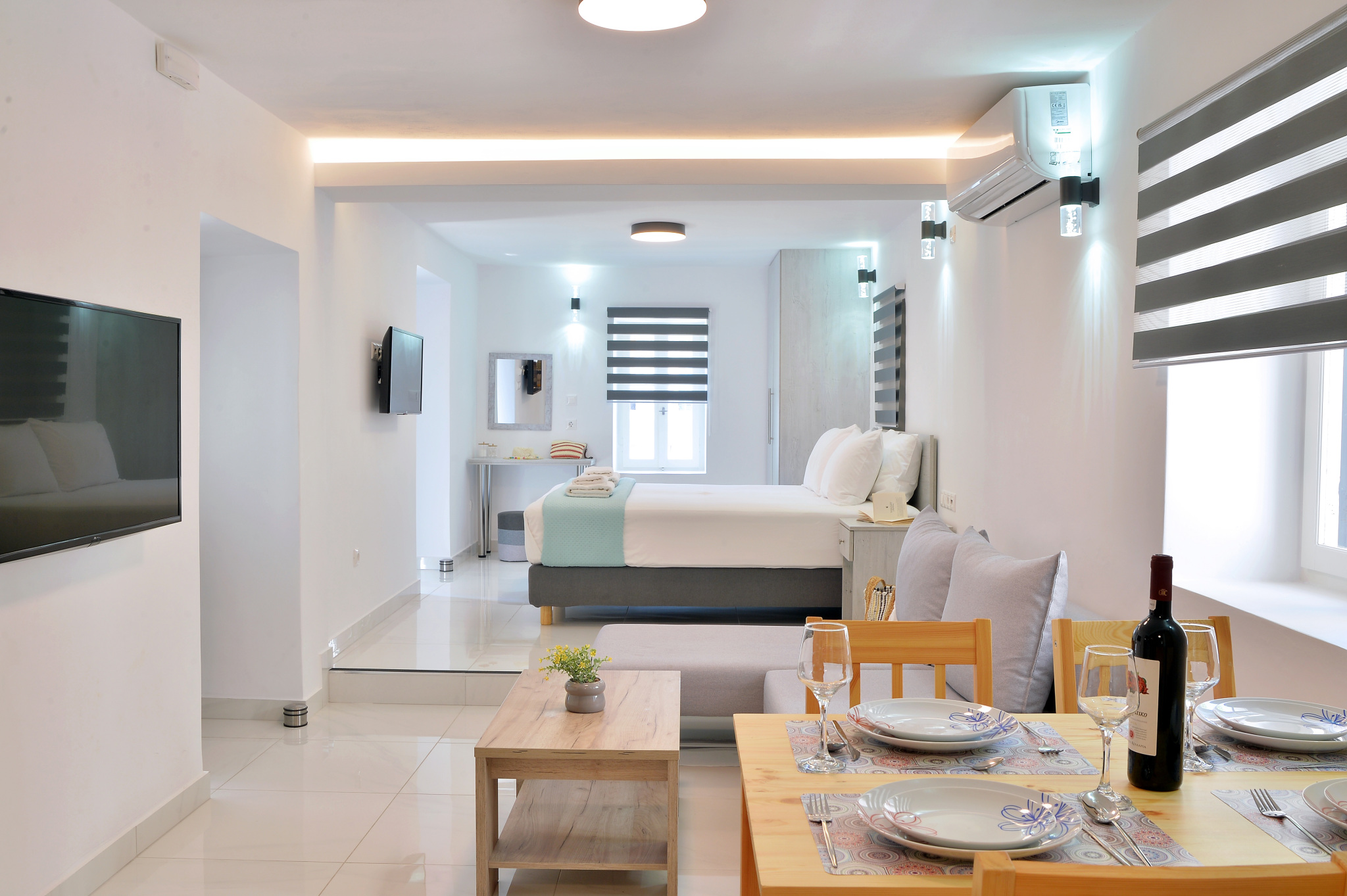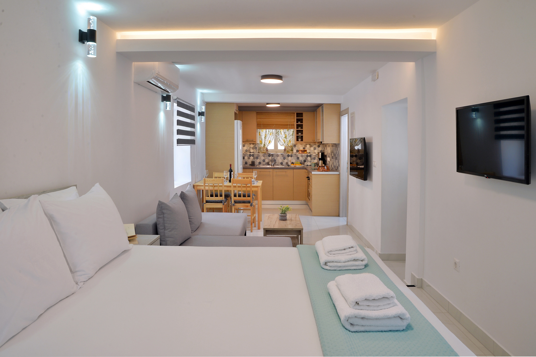 It is fully equipped with sleeping mattresses by GrecoStrom and a sofa bed by SATO, smart TVs LG 43" and 32" LED wifi with Netflix, Melitta coffee machine, microwave oven, 323 liter fridge-freezer, kitchen with ceramic hobs and oven, high quality amenities, hair dryer and all modern comforts.